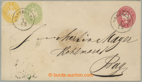 Philately. postal stationery cover Eagle 5 Kreuzer uprated with stamp Eagle 2 Kreuzer and 3 Kreuzer., to Prague, CDS KOSTELETZ 1/12; on reverse cut seal, overall fine, ex Vorisek (Image) (Image2)
