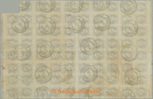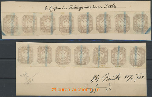 Philately. ANK.29, Coat of arms 1,05 Kreuzer, str-of-8 and str-of-7 on carton with descriptions from Viennese Postarchiv, cancelled by blue strokes of pen, c.v.. for used complexes - ca. 3.200EUR, for these complexes as stamps *