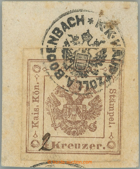 Philately. ANK.4I, Coat of arms 4 K with transcription 2, PROVISORIUM BODENBACH on cut-square with cancel. BODENBACH K.u.K.. HAUPTZOLLA; certificate Bolaffi and Ferchenbauer, c.v.. 2.500EUR (Image) (Image2)