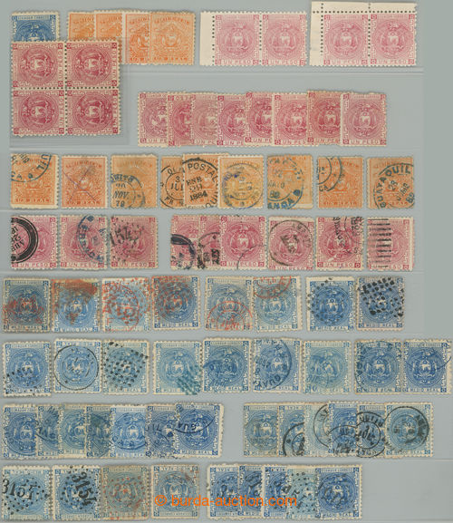 Philately. SELECTION / Mi.5-7, specialized selection of issue Coat of arms, the third issue, 40x ½R, 13x 1R, 17x 1P and two pairs and block of four, 21 unused, types on ½R, red and blue postmarks, 10x French office 3154, from that