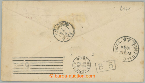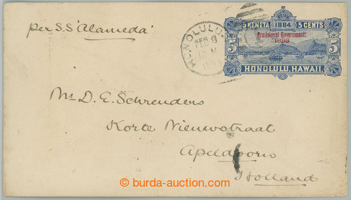 Philately. postal stationery cover Honolulu 5c blue, issue 1884 with red overprint PROVISIONAL GOVERNMENT 1893, Sc.U12, to Netherlands, CDS HONOLULU FEB.8. 1894, through San Francisco, arrival APELDOORN; slightly toned, overall