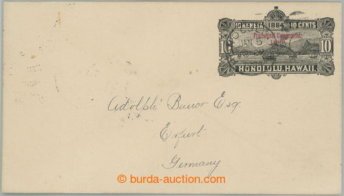 Philately. postal stationery cover Honolulu 10c black with red overprint PROVISIONAL GOVERNMENT 1893, to Germany, CDS HONOLULU JAN.5. 1894, through San Francisco, arrival ERFURT; overall fine (Image) (Image2)