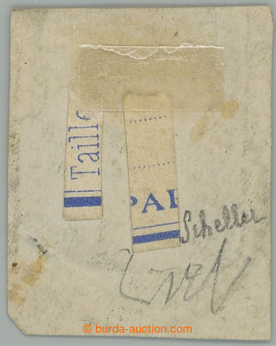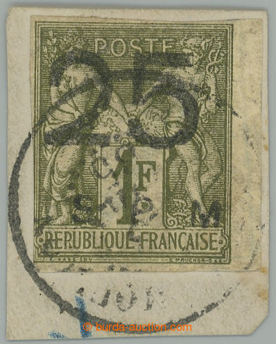 Philately. Yv.2, overprint Allegory 25C/1Fr olive, on small cut-square; irregular margins, exp. Scheller, c.v.. 4.000EUR, very rare stamp