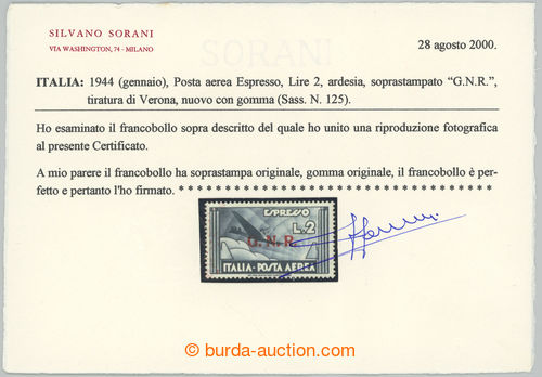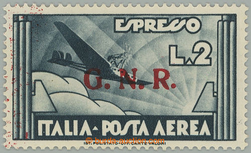 Philately. Repubblica Sociale Italiana / Airmail Sass. Aerea 125, Airplane 2 Lire with overprint GNR (Guardia Nazionale Reppublicana); fine piece with certificate Sorani, c.v.. * 900EUR (Image) (Image2)