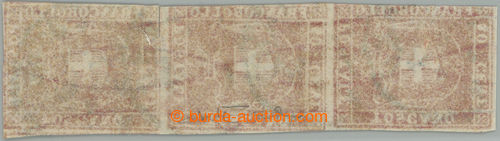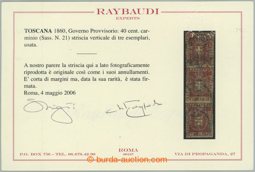 Philately. GOVERNO PROVVISORIO / Sass.21, vertical strip of 3 Coat of arms 40c carminio, margins, according to certificate Ryabaudi small margins, otherwise very fine and rare multiple, c.v.. 30.000EUR (Image) (Image2)