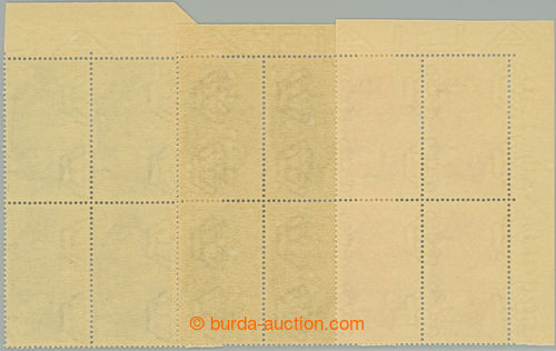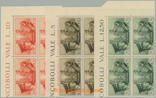 Philately. Sass.457A, 457B, 457C, UNISSUED face-values and colors on stamps A. H. + Mussolini 10C brown, 20C orange and 25C green; in collections always missing, perfect corner blocks of four, c.v.. 2.500EUR ++ (Image) (Image2)