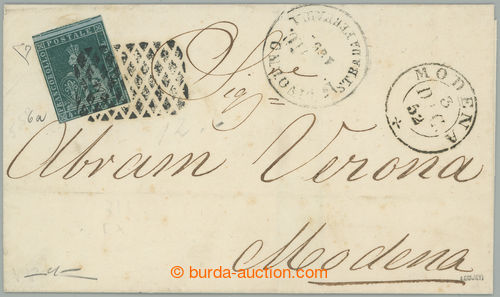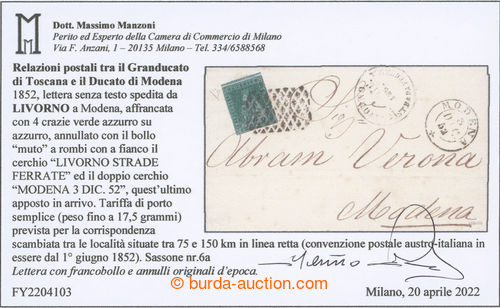 Philately. folded letter sent from Livorno to Modena, with Lion 4Cr blue-green, Sass,6a, CDS LIVORNO STRADE FERRATE, arrival postmark MODENA 3/dIC 52; close margins on 2 sides, good condition, certificate Manzoni, exp. Diena,