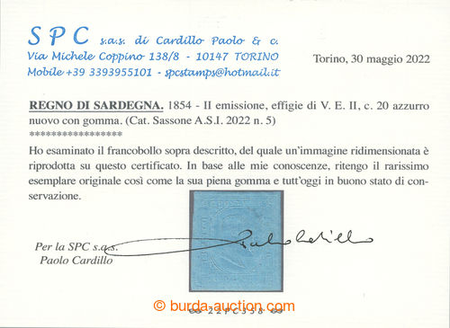 Philately. Sass.5, Viktor Emanuell II. 20c azzurro; fine example with certificate Cardillo and exp. Diena, only small part gum (piena gomma), as without gum - c.v.. for (*) 12.500EUR (Image) (Image2)