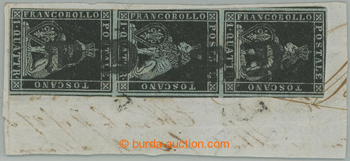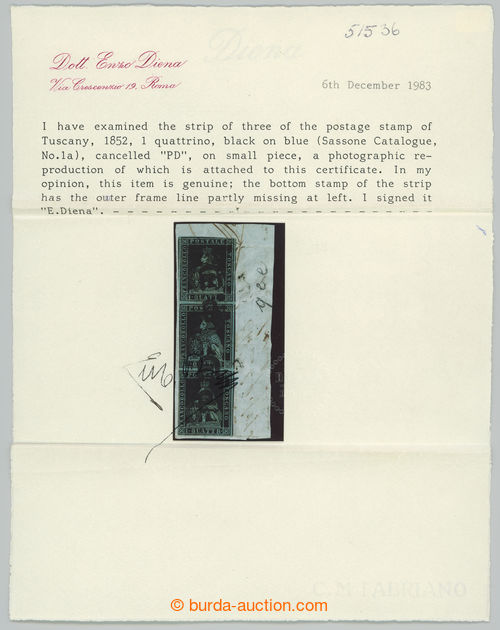 Philately. Sass.1a, str-of-3 Lion 1 quatrino, black on blue paper (neru sur azzurro); fine on cut-square with pmk PD., certificate E. Diena, c.v.. 14.500EUR, rare (Image) (Image2)