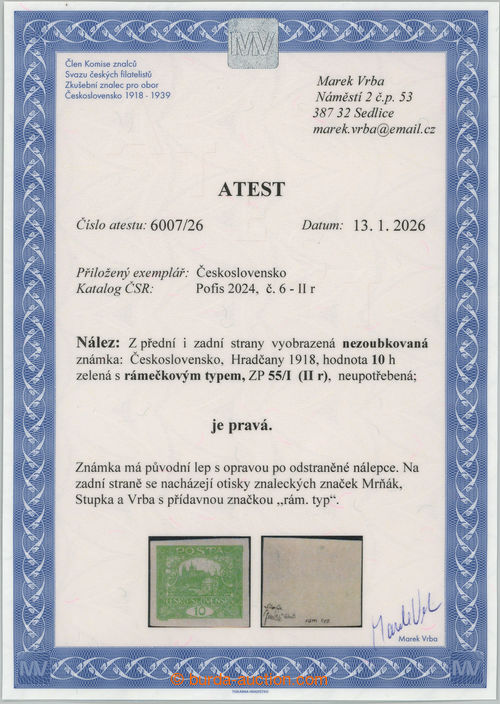 Philately. Pof.6 IIr, 10 green with exceedingly rare RAMECKOVYM type, stamp field 55, printing plate 1; of removed hinge, Vrba certificate, expertized Mrnak, very rare stamp with ojedinelym vyskytem in the market, missing in most