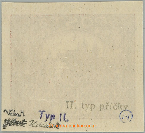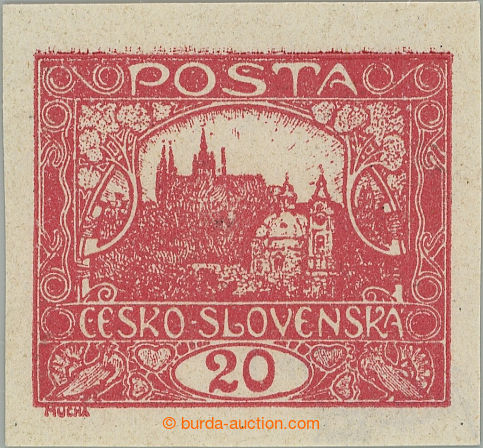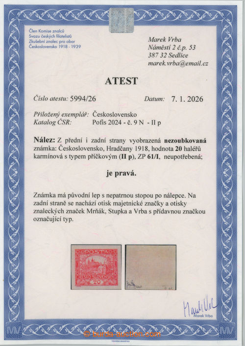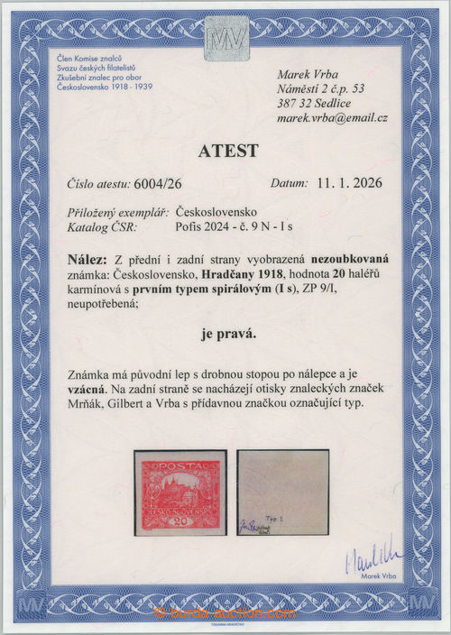 Philately. Pof.9N IIp, 20h carmine, PRICKOVY TYP, stamp field 61/1; lightly hinged, Vrba certificate, expertized Mrnak, very nice piece, sought stamp! (Image) (Image2)