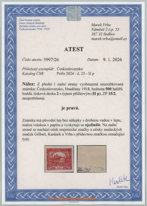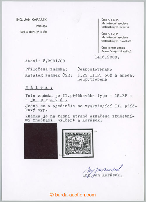 Philately. Pof.25 IIs/IIp, 500h brown with rare PRICKOVYM type, stamp field 15, printing plate 2; mint never hinged, minor gum fault and light vraska in paper, Vrba certificate and Karasek, extraordinary offer hledaneho bar type at