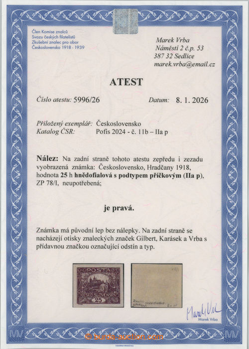 Philately. Pof.11b IIap, 25h brownlila, PRICKOVY subtype IIa, pos. 78/1; mint never hinged, Vrba certificate and exp. Karasek and Gilbert, luxury piece sought stamps! (Image) (Image2)
