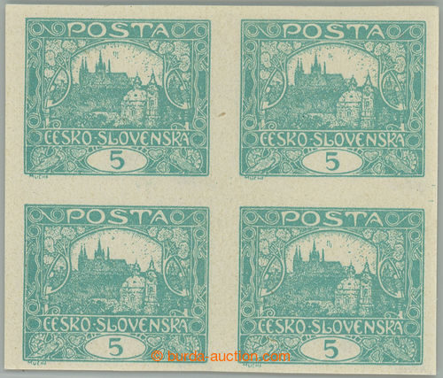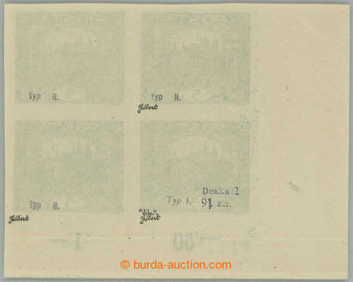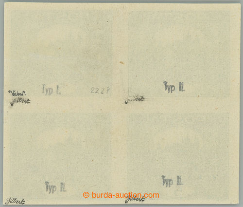 Philately. Pof.4 joined spiral types, 5h blue-green, block of four with joined spiral types, stmp field 21-22 and 31-32/3, on pos. 22 spiral type I.; hinged, nevyrazna production fold in paper through/over L stamp., exp. by Gilbert