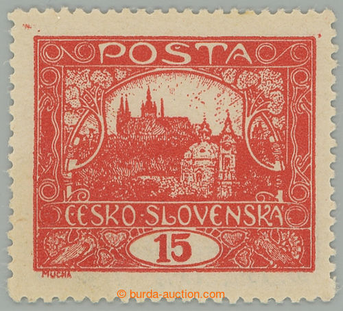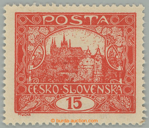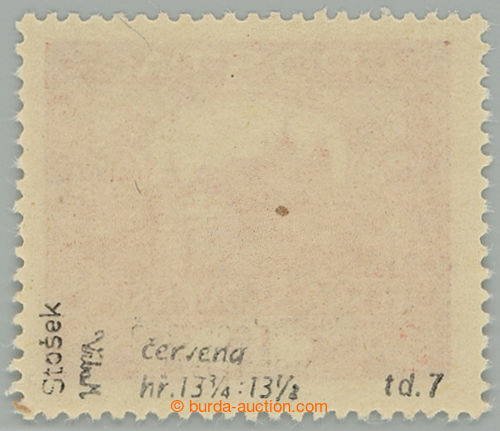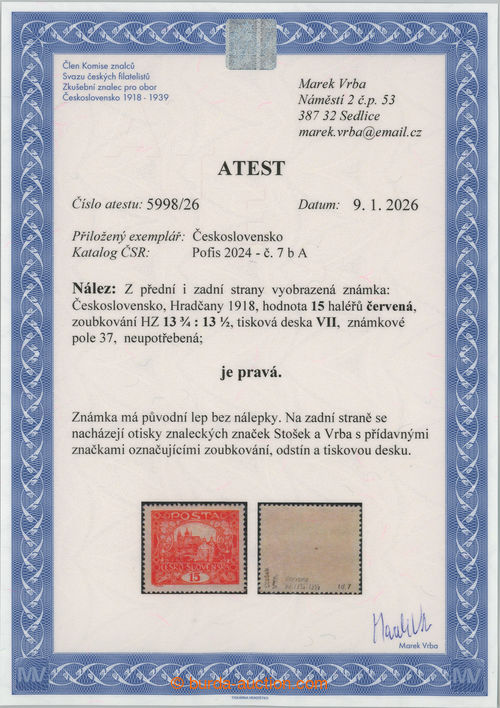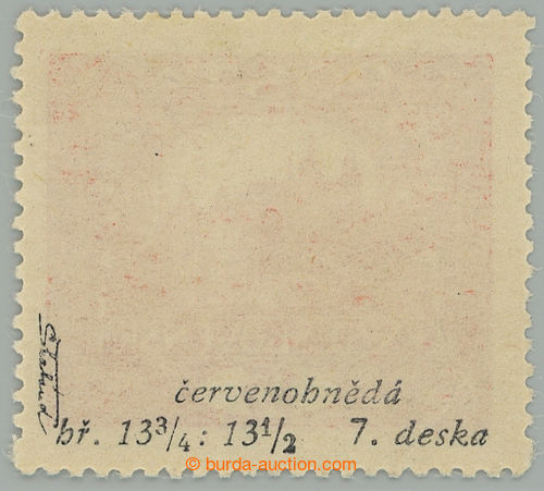 Philately. 7. TISKOVA DESKA / Pof.7Ab IIs, 15h red, comb perforation 13¾ : 13½, plate 7, pos. 42; lightly hinged, certificate and exp. Vrba, very fine example in vyraznem sytem shade, sought color and rare printing plate! (Image) (Image2)