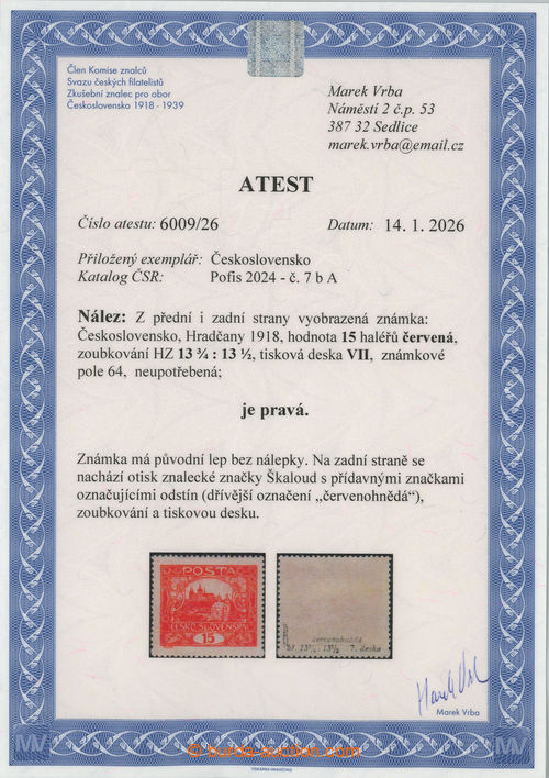 Philately. 7. TISKOVA DESKA / Pof.7Ab, 15h red, comb perforation 13¾ : 13½, plate 7, pos. 64; mint never hinged, Vrba certificate, exp. Skaloud, very fine example in vyraznem sytem shade, sought color and rare printing deska! (Image) (Image2)