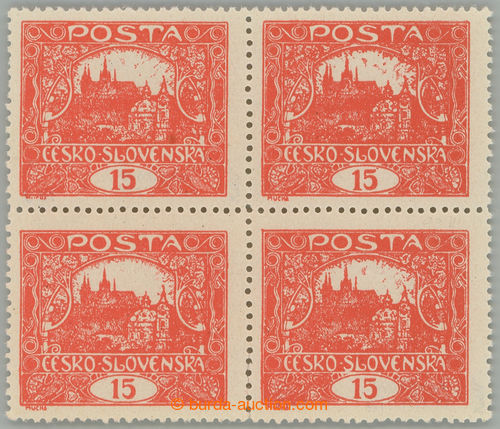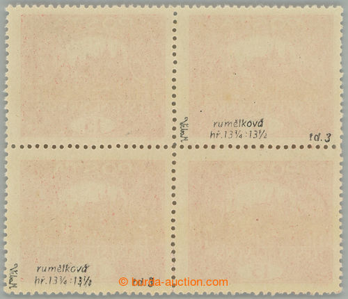 Philately. Pof.7Ad, 15h vermilion with comb perforation 13¾ : 13½, block of four, plate 3, pos. 79-80 / 89-90, plate variety on pos. 79; mint never hinged, exp. Vrba, in blocks of four sought! (Image) (Image2)
