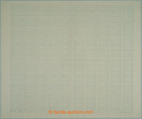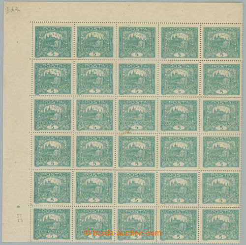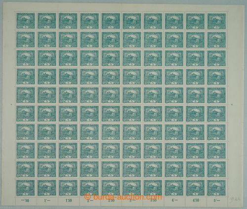 Philately. COUNTER SHEET / Pof.4Ab, 5h dark green, comb perforation 13¾ : 13½, complete 100 stamps sheet, plate 6; mint never hinged, folds in perforation, small tearing in margins, exp. Vrba, rare sheet! (Image) (Image2)