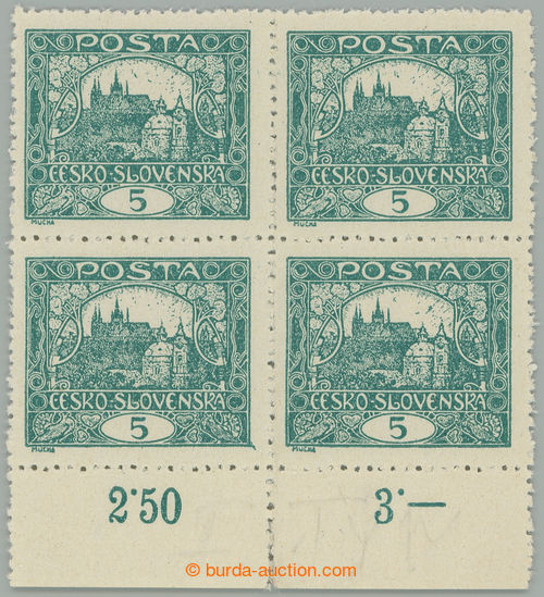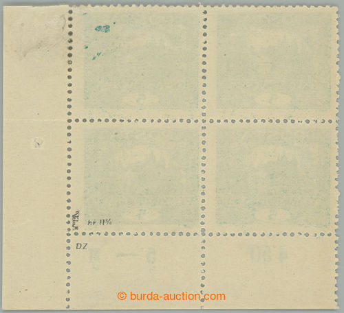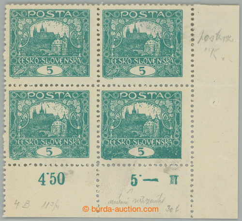 Philately. Pof.4Ca plate mark, 5h dark blue-green, line perforation 13¾, LR corner blk-of-4 with control-numbers and plate mark IV.; mint never hinged, exp. Vrba, sought! (Image) (Image2)