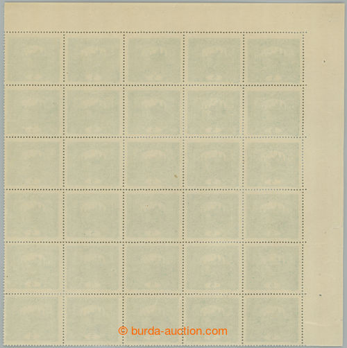 Philately. Pof.4A, 5h blue-green, comb perforation 13¾ : 13½, L upper corner blk-of-30 with margin, plate 2; hinged only in upper block of four