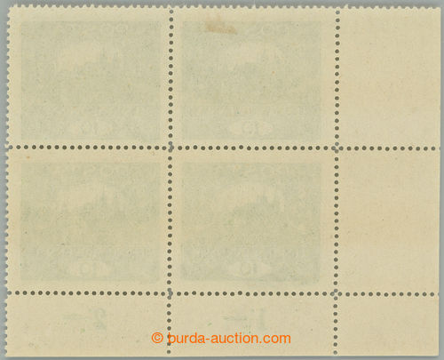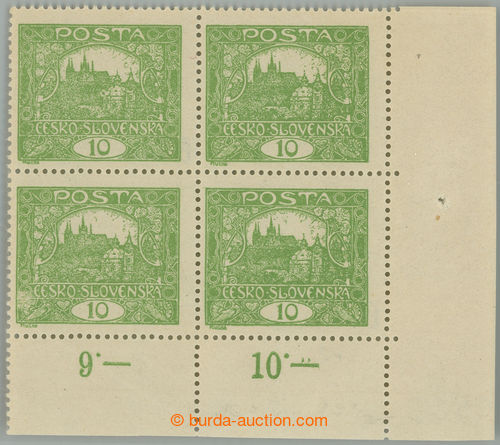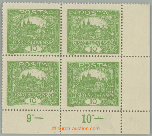 Philately. Pof.6C plate mark, 10h green, line perforation 13¾, LR corner blk-of-4 with plate mark plate 2 - two points above desetinnou pomlkou in/at control-numbers 10.-; mint never hinged, minor gum fault on/for UL stamp., exp.