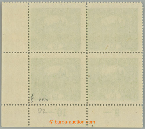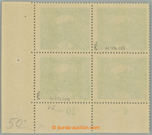 Philately. Pof.6A plate mark, 10h green, comb perforation 13¾ : 13½, LR corner blk-of-4 with plate mark plate 2 - two points above desetinnou pomlkou in/at control-numbers 10.-; mint never hinged, nevyrazny bend in LL corner, exp.