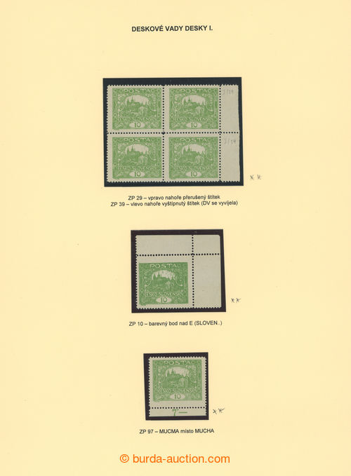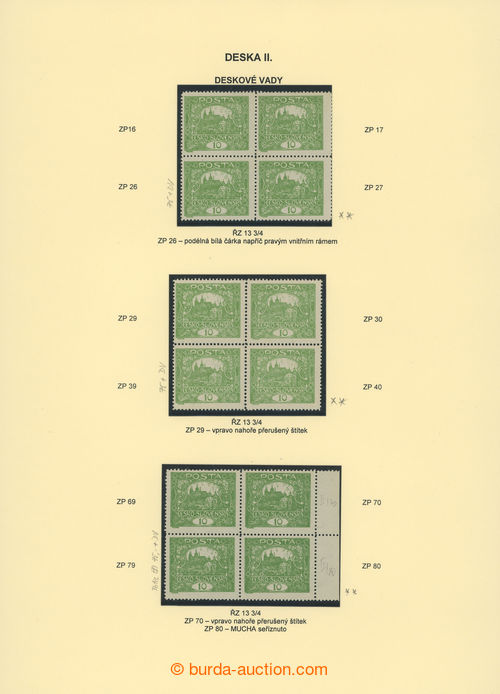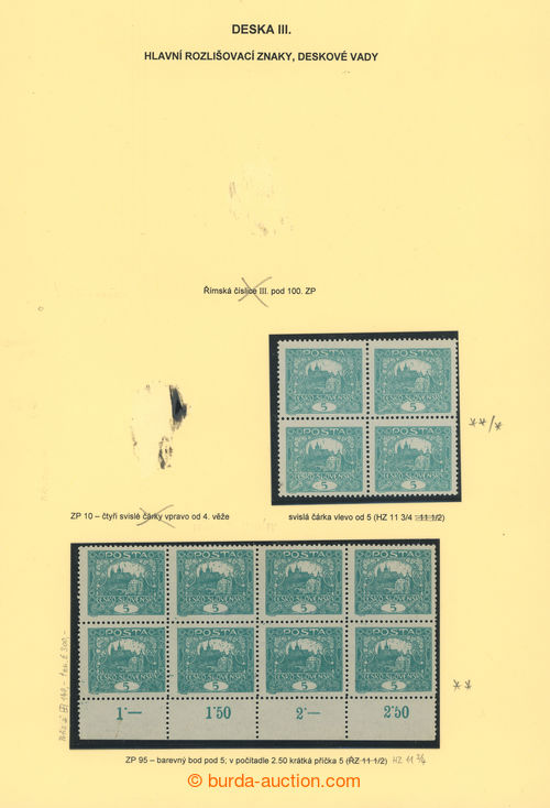 Philately. Pof.6C, 10h green, line perforation 13¾, comp. 6 pcs of bloks of four, from that 2x corner, determined plate variety, plate, on 3 exhibit sheets; mint never hinged (Image) (Image2)