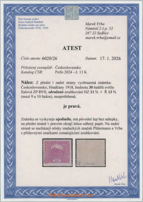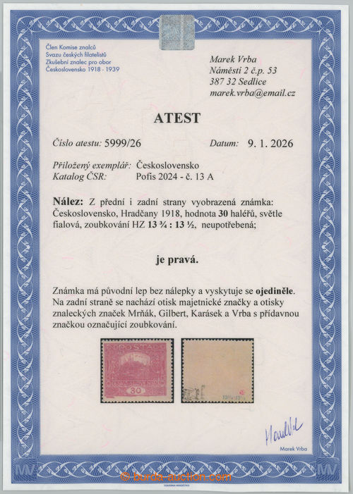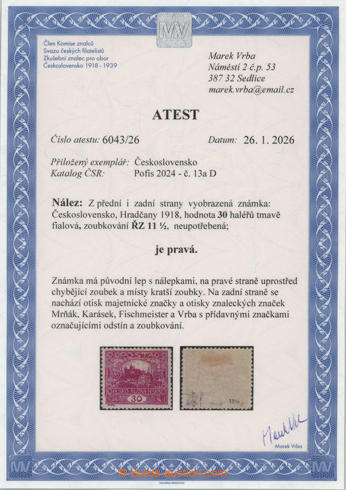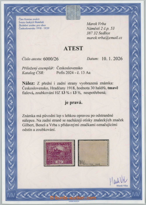 Philately. Pof.13Aa, 30h dark violet with rare perf comb perforation 13¾ : 13½; reparation hinged, Vrba certificate, expertized Gilbert and Benes, rare stamp! (Image) (Image2)