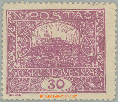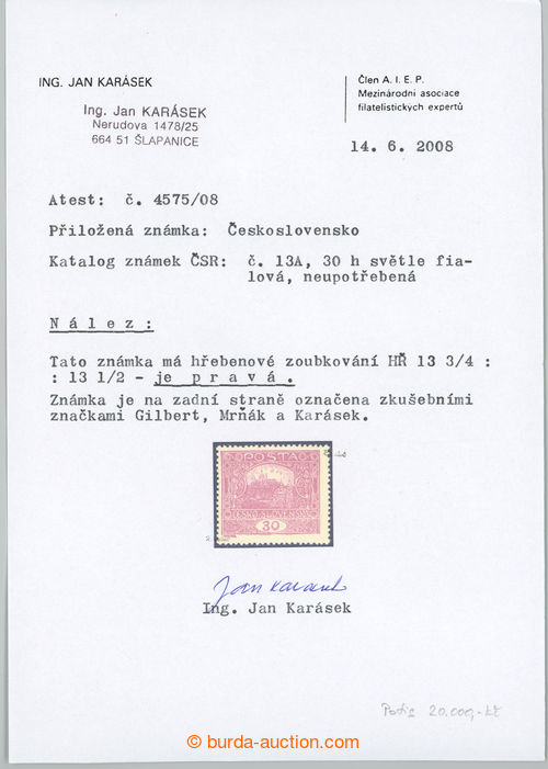 Philately. Pof.13A, 30h light violet with rare perf comb perforation 13¾ : 13½; superb piece mint never hinged, very fine perf, Vrba certificate and Karasek, expertized Gilbert, Karasek and Vrba, very rare stamp in/at premiove