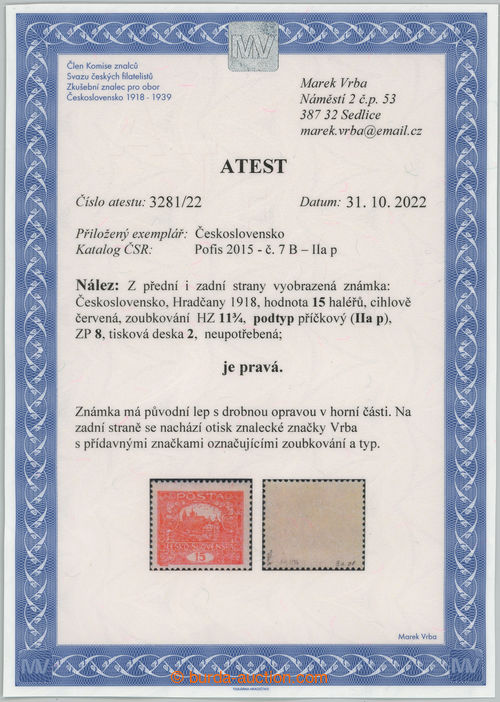 Philately. Pof.7B, IIap, 15h bricky red, line perforation 11¾, PRICKOVY subtype IIa on pos. 8, plate 2; lightly hinged, certificate and exp. Vrba, very fine example subtype bar on/for rare perf! (Image) (Image2)