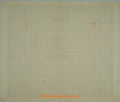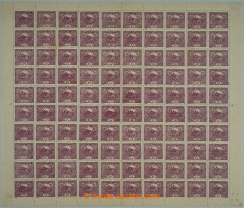 Philately. COUNTER SHEET / Pof.13Ba, 30h dark violet, perf comb perforation 11¾, complete 100 pcs of, plate 2; mint never hinged, several brown stains, viewing of quality recommended, small permit in perforation in margins, exp.