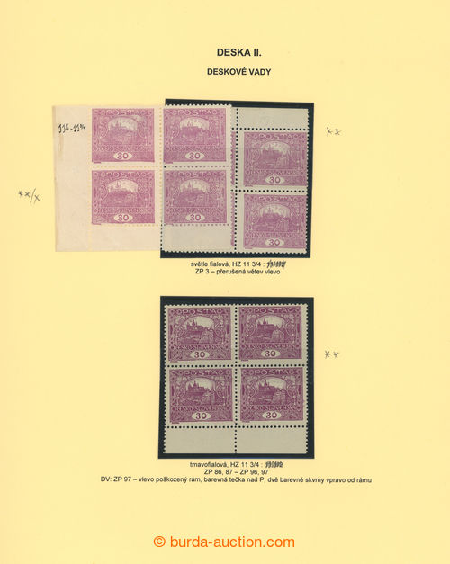 Philately. Pof.13B, 30h light and dark violet, comp. 3 pcs of marginal block-of-4, 1x corner blk-of-4 and 2 pcs of single stamp., determined plate variety and plate, on 2 exhibit sheets with descriptions; mint never hinged (Image) (Image2)