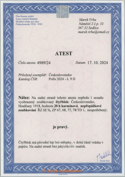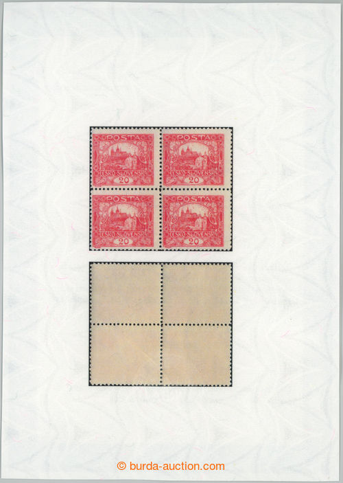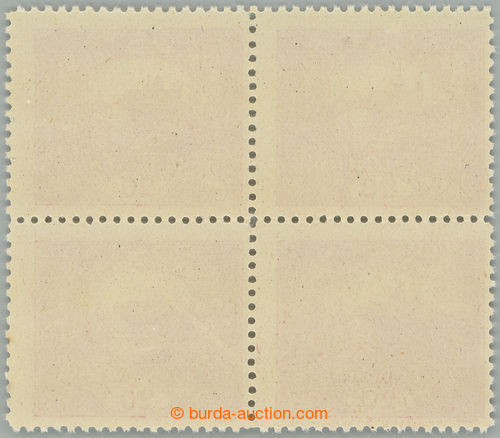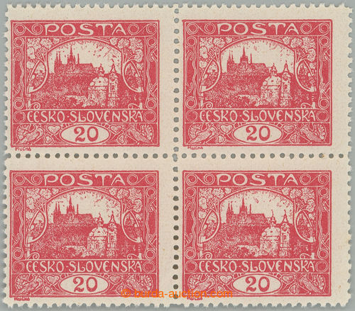 Philately. Pof.9D, 20h carmine, block of four with ministerial perf line perforation 11½, stmp field 67-68 and 77-78, printing plate 1; mint never hinged, intaktni without marks, only production fold in paper, Vrba certificate,