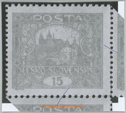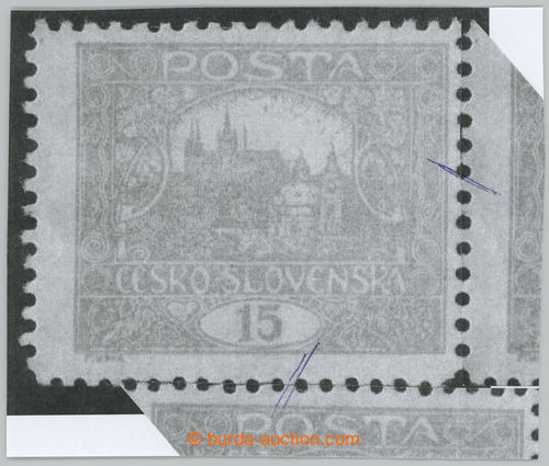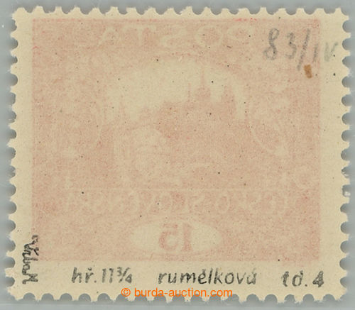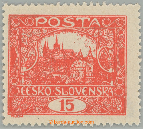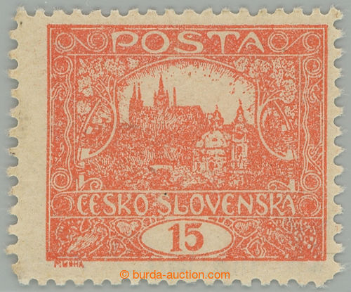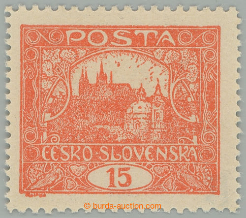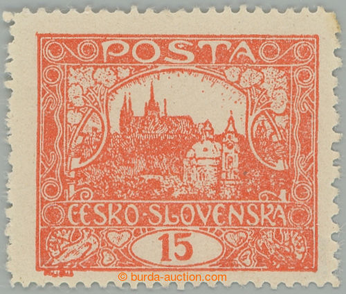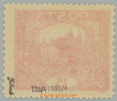 Philately. Pof.7, 15h vermilion, non counter line perforation 13¾ : 10¾, open spiral, pos. 85, plate 6, thin/light offset; mint never hinged, exp. by Gilbert., c.v.. 2.000CZK (Image) (Image2)