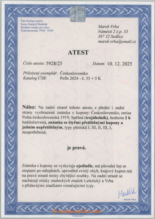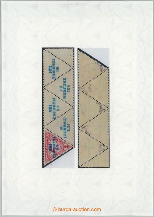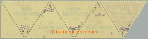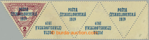 Philately. Pof.55 K+KN, Triangle 2h brown-red with 4 overprinted and one unoverprinted coupon in horiz. stripe, overprint types I+III+II+III+I; lightly hinged, bend in the middle and on/for right margin with short teeth, Vrba
