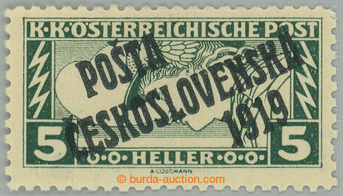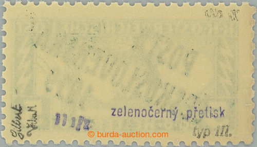Philately. Pof.58Ba, Rectangle 5h green, ZELENOCERNY overprint III. type, rarer perf line perforation 11½; overall very fine example mint never hinged, Vrba certificate, exp. by Gilbert and Vrba, specialist sought stamp! (Image) (Image2)