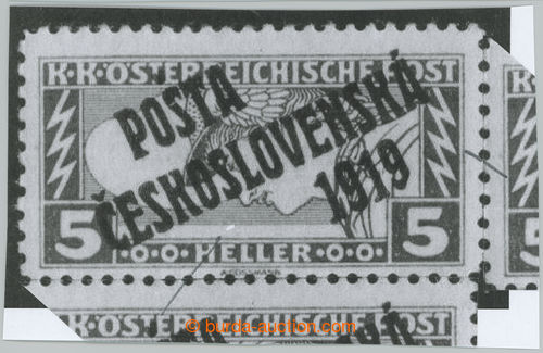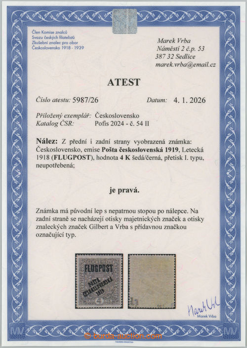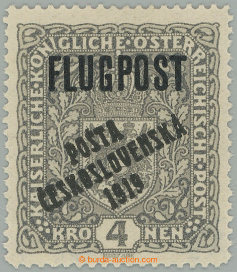 Philately. Pof.54II, Air FLUGPOST 4 Koruna grey / black, overprint type I.; lightly hinged, Vrba certificate, exp. by Gilbert., sought stamp in good quality! (Image) (Image2)