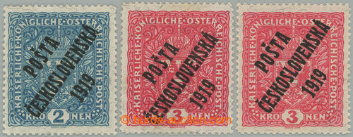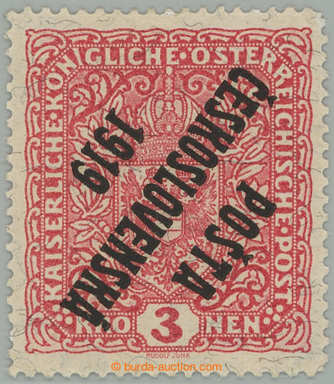Philately. Pof.49b Pp, Coat of arms 3 Koruna red, granite paper, inverted overprint, type I.; hinged, minor faults, exp. by Leseticky and Vrba
