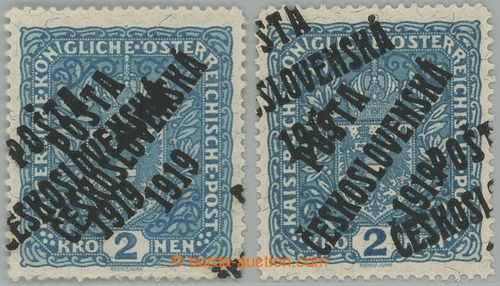 Philately. Pof.48bII production flaw, Coat of arms 2 Koruna light blue, wide on granite paper, 2 pcs of with double, vzajemne variously significantly pootocenym overprint; mint never hinged, exp. by Leseticky., Karasek and Vrba,