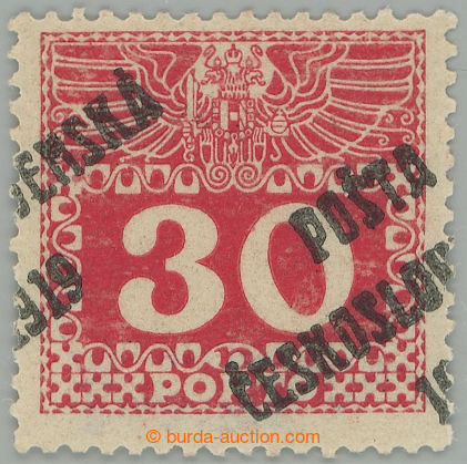Philately. Pof.70 production flaw, Large numerals 30h red, expressive shift of overprint III. type out of stmp.; hinged, Vrba certificate, exp. by Leseticky., Tri, Mrnak and Vrba (Image) (Image2)