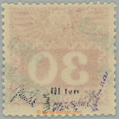 Philately. Pof.70, Large numerals 30h red, overprint type II.; lightly hinged, L lower small brownish in/at tooth, Vrba certificate, exp. by Karasek