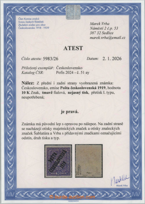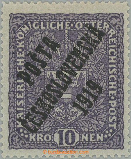 Philately. Pof.51ay, Coat of arms 10K dark violet, unclear print, type I.; small repaired hinged, Vrba certificate, exp. by Sablatura., Franek, Mahr and Vrba (Image) (Image2)