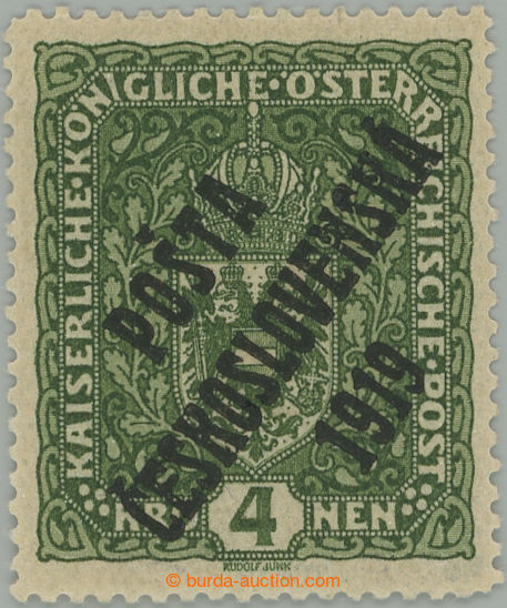 Philately. Pof.50aI, Coat of arms 4 Koruna dark green, overprint II. type; hinged, exp. by Gilbert., Leseticky and Vrba (Image) (Image2)