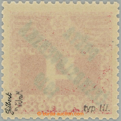 Philately. Pof.66, Large numerals 4h red, overprint type III.; mint never hinged, exp. by Gilbert and Vrba (Image) (Image2)