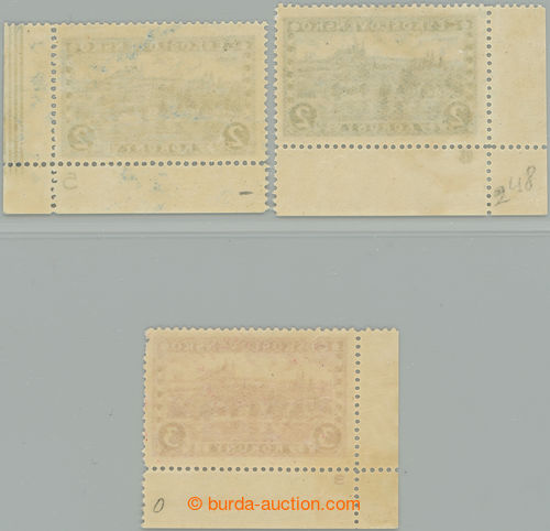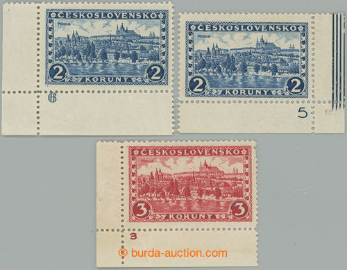 Philately. Pof.229+230 plate number, Prague 2CZK blue L and LR corner piece with plate number 6 and 5 + value 3CZK red, L the bottom corner piece with plate number 3; mint never hinged (Image) (Image2)