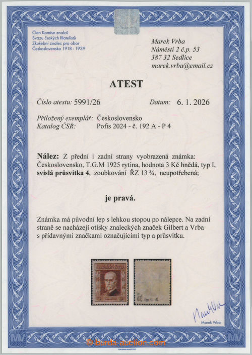 Philately. Pof.192A, Gravure 3CZK brown, type I., vertical wmk P4; hinged, sporadically with opravou R, short tooth, overall but fine piece, Vrba certificate, exp. by Gilbert., rare stamp! (Image) (Image2)