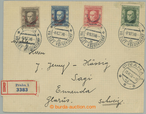 Philately. VIII. Sokol festival / heavier Reg letter to Switzerland, franked by complete set Pof.183-186, CDS PRAGUE 1/ 6.VII.26, supplemented with CDS PRAGUE 1/ 25.VI.26 on reverse arrival ENNENDA 26.VII.26; good condition, rare