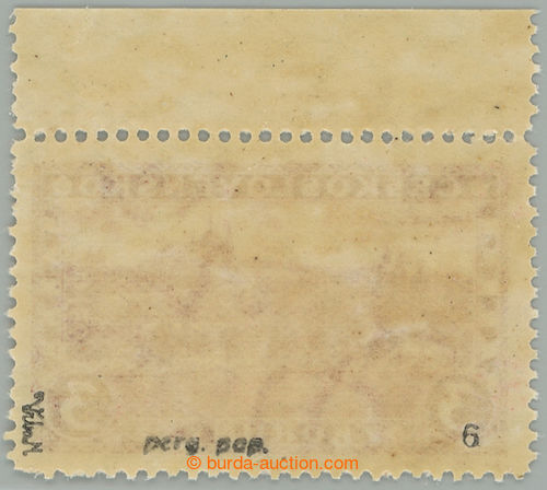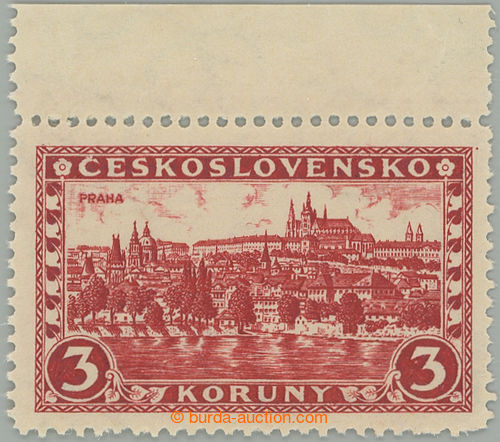 Philately. Pof.226x, Prague 3CZK red with upper margin, parchment paper, wmk P6; mint never hinged, according to short teeth, exp. Vrba