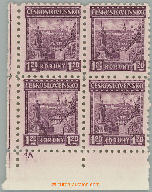 Philately. Pof.219 plate number, Strahov 1,20CZK purple-red without bands in gum, LL corner blk-of-4 with plate number 1A; mint never hinged, minor gum fault, exp. Vrba (Image) (Image2)