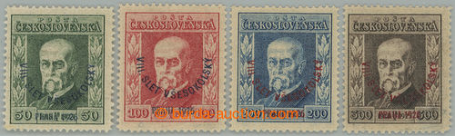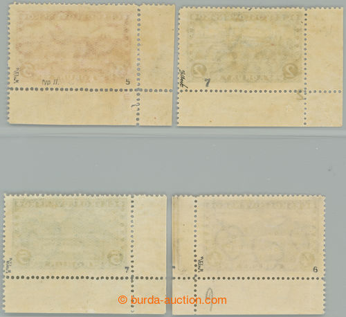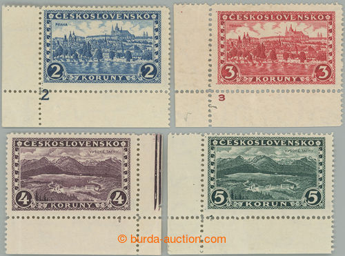 Philately. Pof.225-228 plate number, Prague, Tatras, complete set in/at bottom corner pcs. with plate number 2, 3, 1 and 1, wmk 7, 5, 6 and 7; mint never hinged, exp. by Gilbert and Vrba (Image) (Image2)